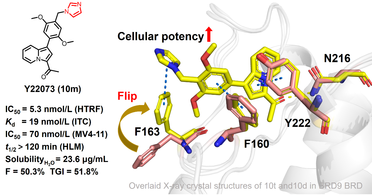 針對(duì)溴結(jié)構(gòu)域家族蛋白結(jié)構(gòu)高度相似導(dǎo)致的抑制劑選擇性難題,團(tuán)隊(duì)通過(guò)優(yōu)勢(shì)骨架化合物庫(kù)篩選、晶體結(jié)構(gòu)解析以及基于結(jié)構(gòu)的藥物設(shè)計(jì),成功開(kāi)發(fā)出可用于AML治療的新型BRD9選擇性溴結(jié)構(gòu)域抑制劑Y22073。研究人員從基于結(jié)構(gòu)活性關(guān)系(SAR)的優(yōu)化策略中發(fā)現(xiàn)了咪唑類(lèi)化合物具有卓越的體外抗增殖活性。合作團(tuán)隊(duì)通過(guò)X射線晶體結(jié)構(gòu)解析(分辨率最高達(dá)1.78 ?)精準(zhǔn)捕捉到BRD9的ZA通道存在一個(gè)獨(dú)特的“可調(diào)控開(kāi)關(guān)”——Phe163翻轉(zhuǎn)開(kāi)關(guān)。抑制劑中關(guān)鍵的咪唑藥效基團(tuán)能夠誘導(dǎo)BRD9蛋白的Phe163殘基翻轉(zhuǎn)并與其形成穩(wěn)定的π-π相互作用。然而,其他溴結(jié)構(gòu)域(如BRD7、BRD4、CECR2)中對(duì)應(yīng)位置的殘基無(wú)法與咪唑基形成有效相互作用,直接證明了該機(jī)制的特異性。這一分子層面的突破性發(fā)現(xiàn)不僅顯著提升了化合物的體外活性,也使得Y22073成為首個(gè)在AML模型中展現(xiàn)明確疾病表型干預(yù)能力的BRD9抑制劑。研究團(tuán)隊(duì)還創(chuàng)新性地采用該修飾策略對(duì)現(xiàn)有BRD9抑制劑進(jìn)行結(jié)構(gòu)改造,結(jié)果表明,經(jīng)此策略修飾后的化合物在體外的活性顯著提升,進(jìn)一步證實(shí)咪唑基團(tuán)可通過(guò)調(diào)控獨(dú)特的Phe163開(kāi)關(guān),在提高活性方面發(fā)揮關(guān)鍵作用。Y22073表現(xiàn)出良好的溴結(jié)構(gòu)域選擇性、代謝穩(wěn)定性、溶解性并兼具理想的藥代動(dòng)力學(xué)特性,在MV4-11異種移植小鼠模型中表現(xiàn)出顯著的口服抗腫瘤效果,且無(wú)明顯毒性。綜合其優(yōu)異的體外活性、體內(nèi)療效及成藥性特征,Y22073作為具有First-in-Class潛力的BRD9溴結(jié)構(gòu)域選擇性抑制劑,為急性髓系白血病的靶向治療提供了極具臨床轉(zhuǎn)化價(jià)值的新型候選藥物。