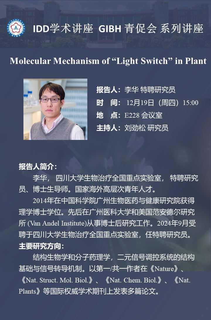 2024年12月19日IDD學術(shù)講座&GIBH青促會系列講座:Molecular Mechanism of “Light Switch” in Plant